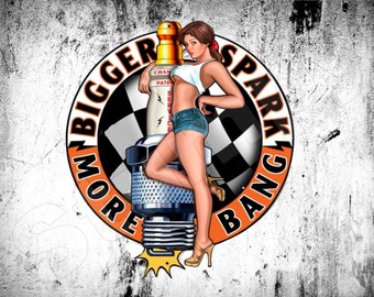 SIZE All sizes and all colors are available in our shop Please refer to our measuring size guide in the pictures before you order!Info pay PayPal PayPal 24/7 Something went wrong View cart for detailsBuy now A print featuring a sexy pinup girl standing by a giant spark plug In the background there is a sign which says bigger spark, bigger bang A great choice for any car enthusiast who also admires pinup girls Available colors Black, Gray, Orange, Hot Pink, Purple, Red, White, Navy Blue, Green, Ash Gray, Brown, Charcoal, Light Pink, Military Green, Royal Blue, Yellow